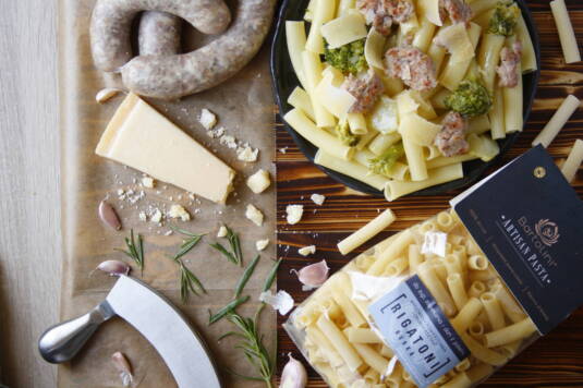 Z brokuła odcinamy różyczki i gotujemy we wrzącej, osolonej wodzie przez ok. 7 min. Na patelni rozgrzewamy oliwę z oliwek i dodajemy pokrojone w piórka cebule. Smażymy na średnim ogniu przez ok. 4 min. Dodajemy posiekany czosnek, a po 2 min. rozdrobnioną kiełbasę i posiekany tymianek. Po 3 min. dodajemy wino. Mieszamy i zostawiamy całość na ok. 2 min., w międzyczasie gotując w wodzie po brokułach makaron zgodnie z przepisem na opakowaniu (al dente). Doprawiamy do smaku pieprzem i niewielką ilością soli i dodajemy na patelnię wcześniej ugotowane brokuły oraz odrobinę wody pozostałej po ich gotowaniu. Zostawiamy pod przykryciem przez ok 3 min. Tak przygotowane danie łączymy na patelni z makaronem. Serwujemy z dużymi wiórkami sera, skrapiając porcję słuszną ilością oliwy truflowej.